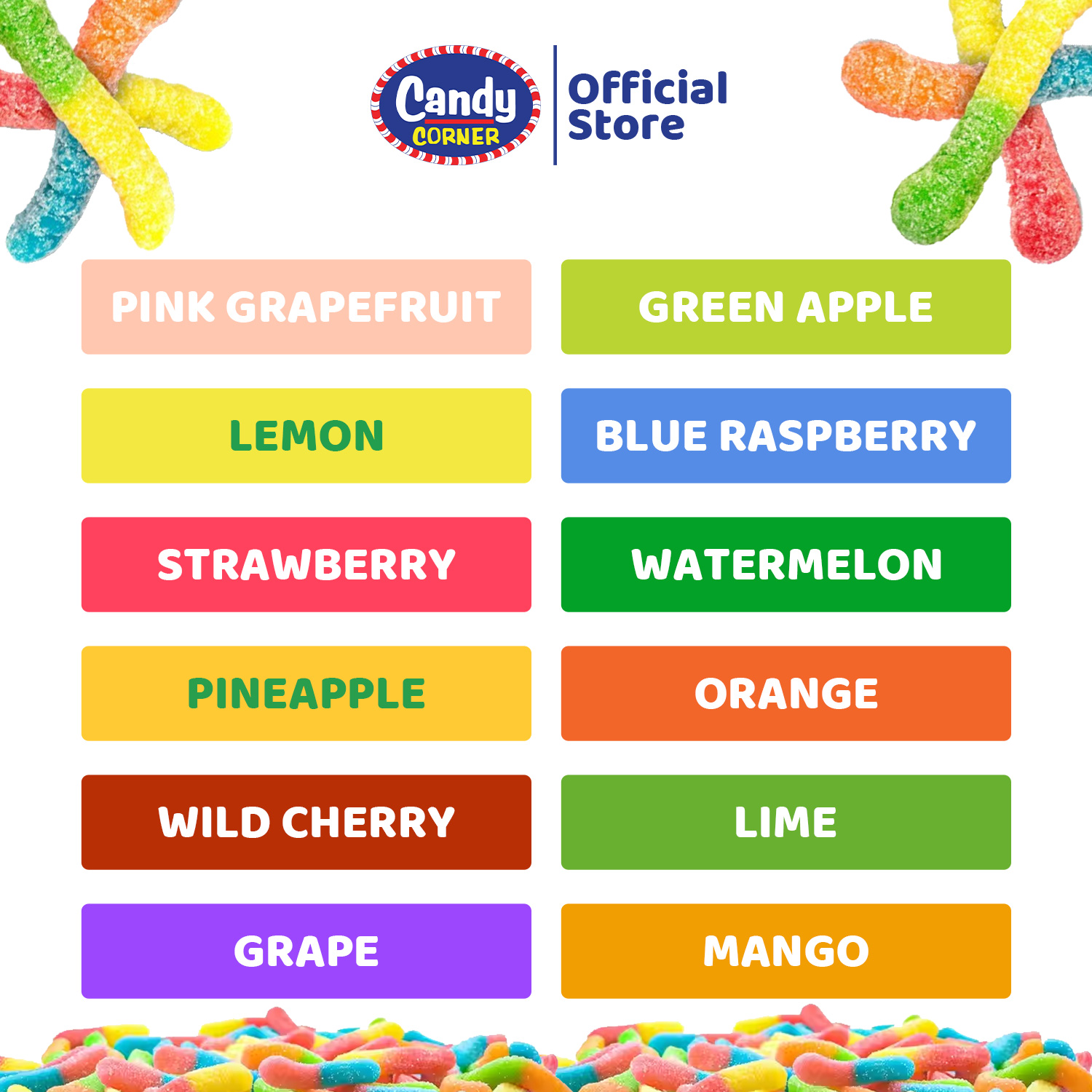 These sour gummies pack a tangy punch with mouth-puckering flavors like Cherry, Strawberry, Mango, Pineapple, Lemon, Orange, Green Apple, Watermelon, Pink Grapefruit, Lime, Blue Raspberry, and Grape. 🍋🍓🌈