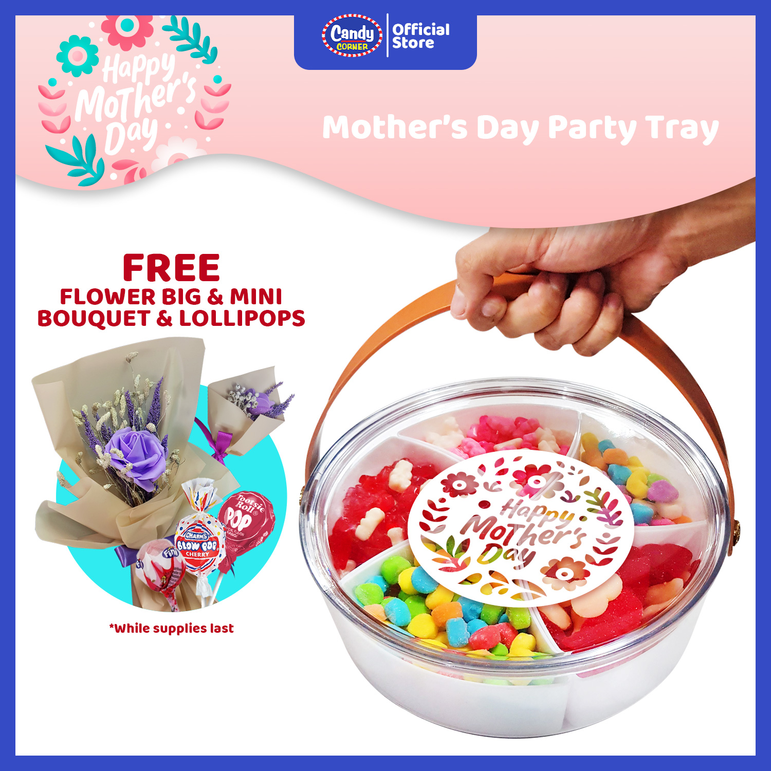 Spoil Mom (and the whole family!) with this jumbo snack tray packed with love. Features a vibrant mix of Albanese gummies—Lovestruck Bears, Share the Love, Sour Hearts, Sour Poppers, and Valentine Bears—all in 300g each. Comes with a giant snack tray with handle and bonus treats: Charms Blow Pop (18g), Tootsie Roll (14g), and Fini Strawberry Cream Pop (16g)—free!